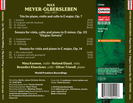 Max Meyer-Olbersleben, born in 1850 in Olbersleben, Thuringia, studied at the Weimar Orchestral School under Franz Liszt, and later at the Royal Music School in Munich under Gabriel Josef Rheinberger and Peter Cornelius. He settled in Würzburg as a professor of counterpoint and composition and served as director of the Royal Conservatory of Music until his retirement in 1920. During his lifetime, 114 works were published, primarily smaller forms such as choral works, songs, and piano pieces. Through his studies in Weimar and Munich, Meyer-Olbersleben was familiar with both the traditionalist and the new German musical language of that era, and thus the chamber music gems recorded here for the first time bear witness to profound Romantic sensibility and the spirit of a new musical awakening.