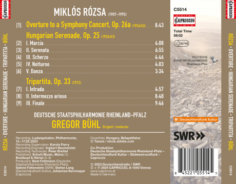 Miklós Rózsa feared that success as a film composer might overshadow his reputation as a composer of classical concert fare. He was right: Three Oscars and 17 Academy Award nominations will do that to you. The two worlds were strangely incompatible and forced Rózsa into what he called his “Double Life” – both the name of one of the films for which he won an Oscar and the title of his autobiography. But the three orchestral works presented here, from his early, middle, and late phase Miklós Rózsa feared that success as a film composer might overshadow his reputation as a composer of classical concert fare. He was right: Three Oscars and 17 Academy Award nominations will do that to you. The two worlds were strangely incompatible and forced Rózsa into what he called his “Double Life” – both the name of one of the films for which he won an Oscar and the title of his autobiography. But the three orchestral works presented here, from his early, middle, and late phases, are a charming introduction to discovering that second side of his.